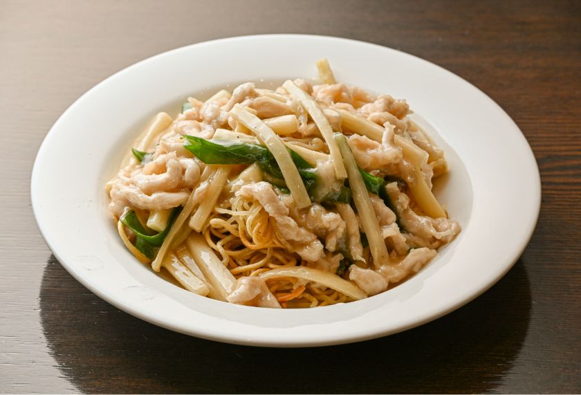 細切りにしたマコモタケと鶏肉の入ったカキソース風味のあんかけ料理です。焼きそば、チャーハンのいずれかをお選びください。