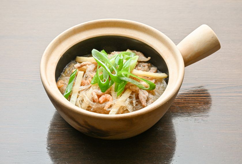 豚バラ肉とマコモタケ、春雨を塩味で煮込みました。風味豊かな干し海老の香りと一緒にお楽しみください。