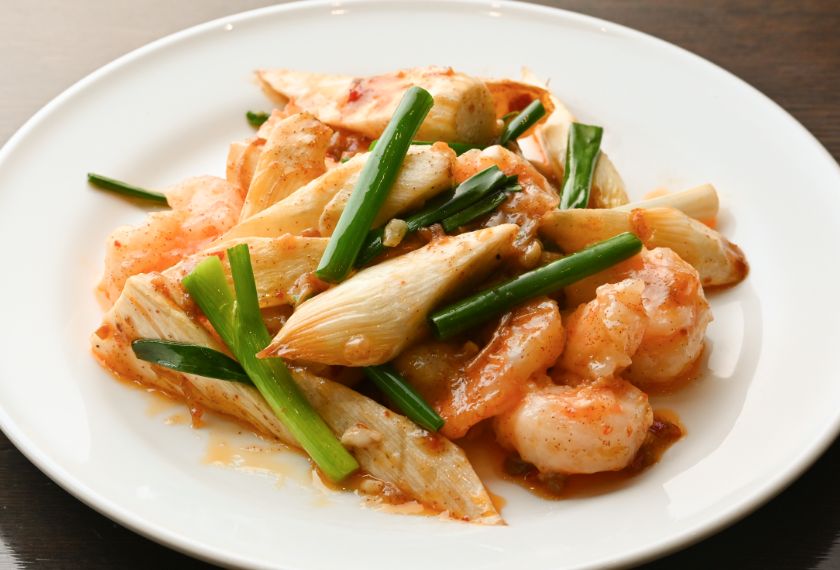 干貝柱、干蝦、ニンニク、唐辛子などをじっくりと炒めた自家製XO醤で大ぶりの海老と炒めました。